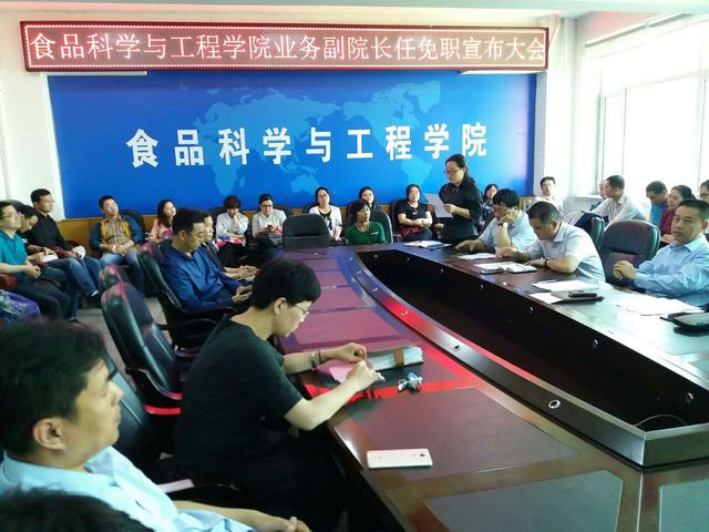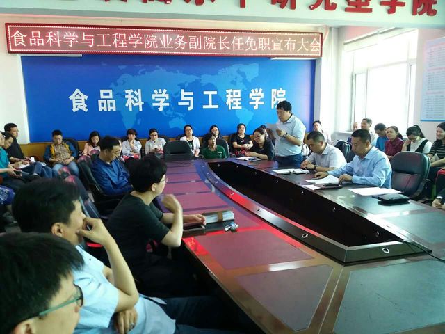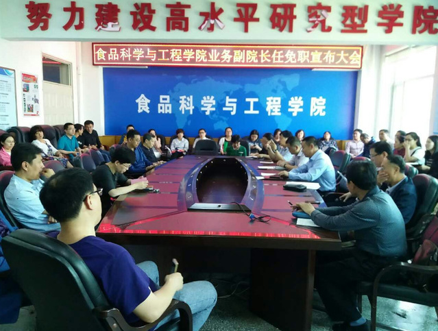 在食品楼三楼会议室召开业务副院长任免职宣布大会。学院前任、现任领导班子,全体教职工参加了会议。会议由学院党委书记高福和同志主持。
