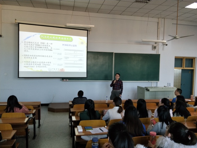 首先,许文涛老师向同学们介绍了功能核酸生物传感器检测新技术,其中包括最基础的核酸概念理论和PCR扩增技术、靶标物质稳定性的探究、功能核酸统一快速检测的思路与搭建食品安全生物传感快速检测技术体系。随后他又结合自身课题研究方向详细的阐述了功能核酸与纳米材料方面的应用,使同学们了解了功能核酸结构的准确预测对于后期实验的重要性;许老师“新型通用接头PCR技术扩增理论”,包括通用接头设计规律,与新型接头PCR扩增模型,从而实现一条引物扩增多个不同产物,达到竞争定量的效果。这些新技术不仅可以检测到DNA的甲基化、肉产品掺假、微生物、微量RNA和黄曲霉毒素,还能检测出重金属,从而实现对食品安全风险因子的检测与控制。