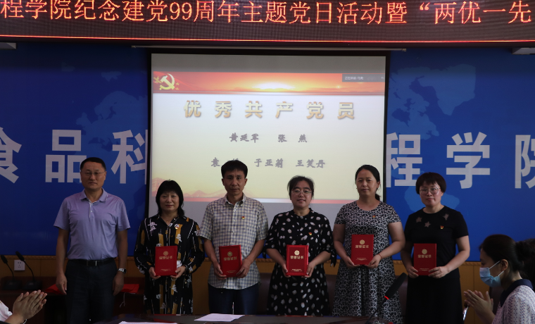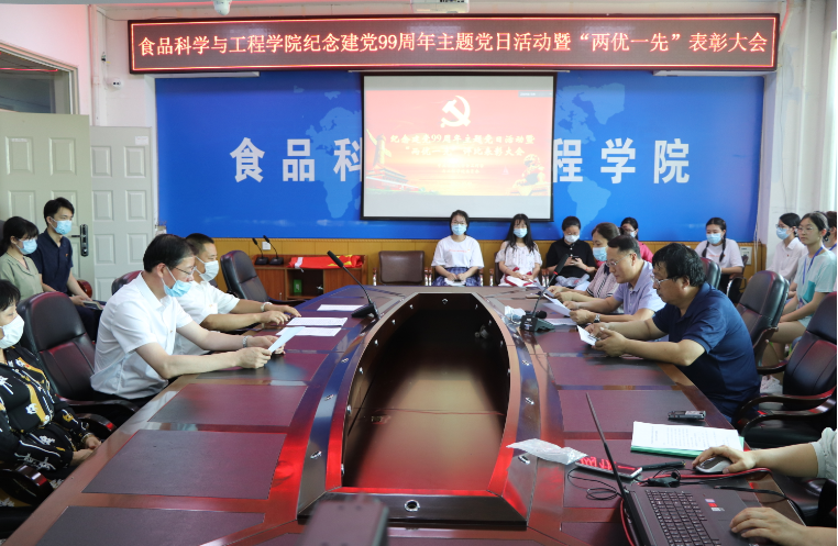 在食品楼三楼会议室举行庆祝建党九十九周年主题党日活动暨“两优一先”表彰大会。学院全体教工党员、学生党员代表通过现场及腾讯会议平台参加了此次会议。会议由学院党委委员、副院长李勇军同志主持。