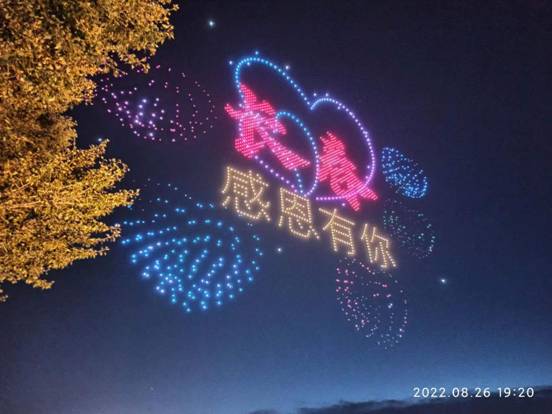 2022年8月27日19时,随着优美的旋律,激昂的解说,2022架无人机在多彩的灯光映衬下,在长春友谊公园上方有序地腾空而起,好似漫天飞舞的流星,让人仿佛置身于科幻电影的拍摄现场。“奋斗者”雕塑、红旗轿车、国际汽车城、现代农业城、“双碳”示范城、科技创新城、新兴消费城、文化创意城的画面在2022架无人机的队形变幻和灯光变化中一一呈现,在天空中描绘出一幅幅壮丽的画卷。尤其是最后一组无人机灯光表演画面“长春——感恩有你”出现在夜空时,现场更是响起雷鸣般的掌声。本次表演有起落交错的队形、魔幻的灯光、优美的旋律,久久回荡,让同志们感受到了科技的震撼。