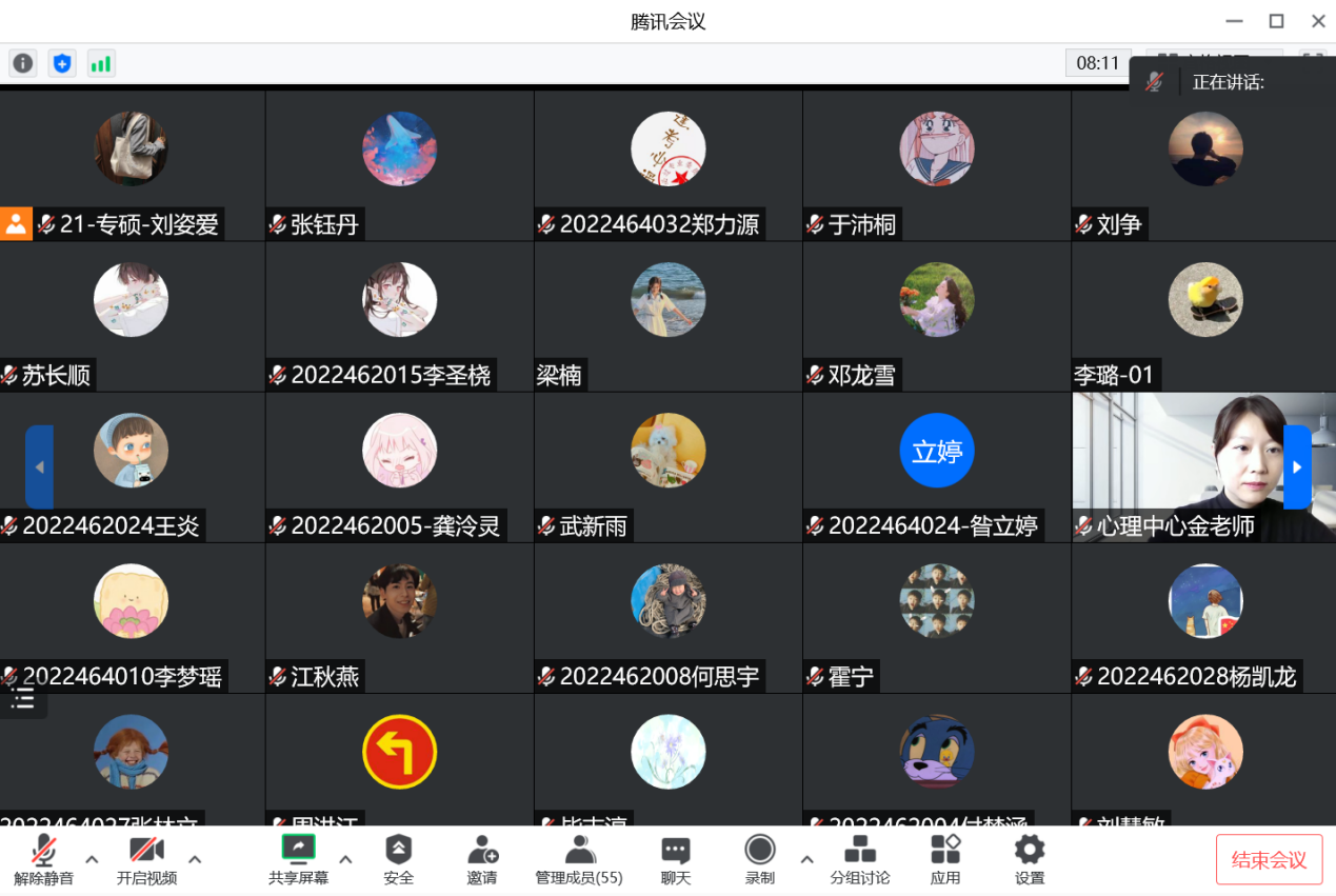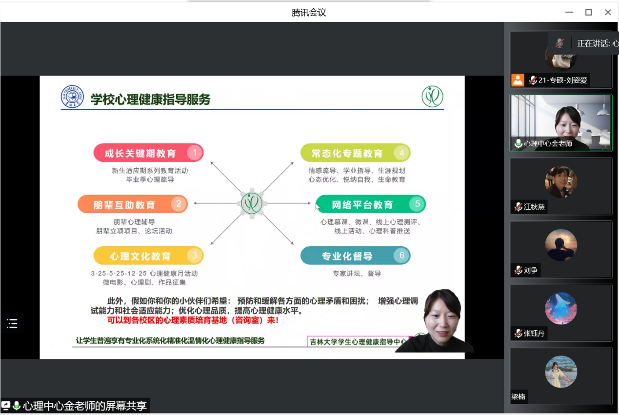 最后,金老师重点介绍了学校的心理健康指导服务,从成长关键期教育、朋辈互助教育直至网络平台教育以及专业化督导,我校拥有一套专业全面的心理健康指导服务系统,助力同学们学会放松,减轻压力,更加轻松愉快地面对生活。