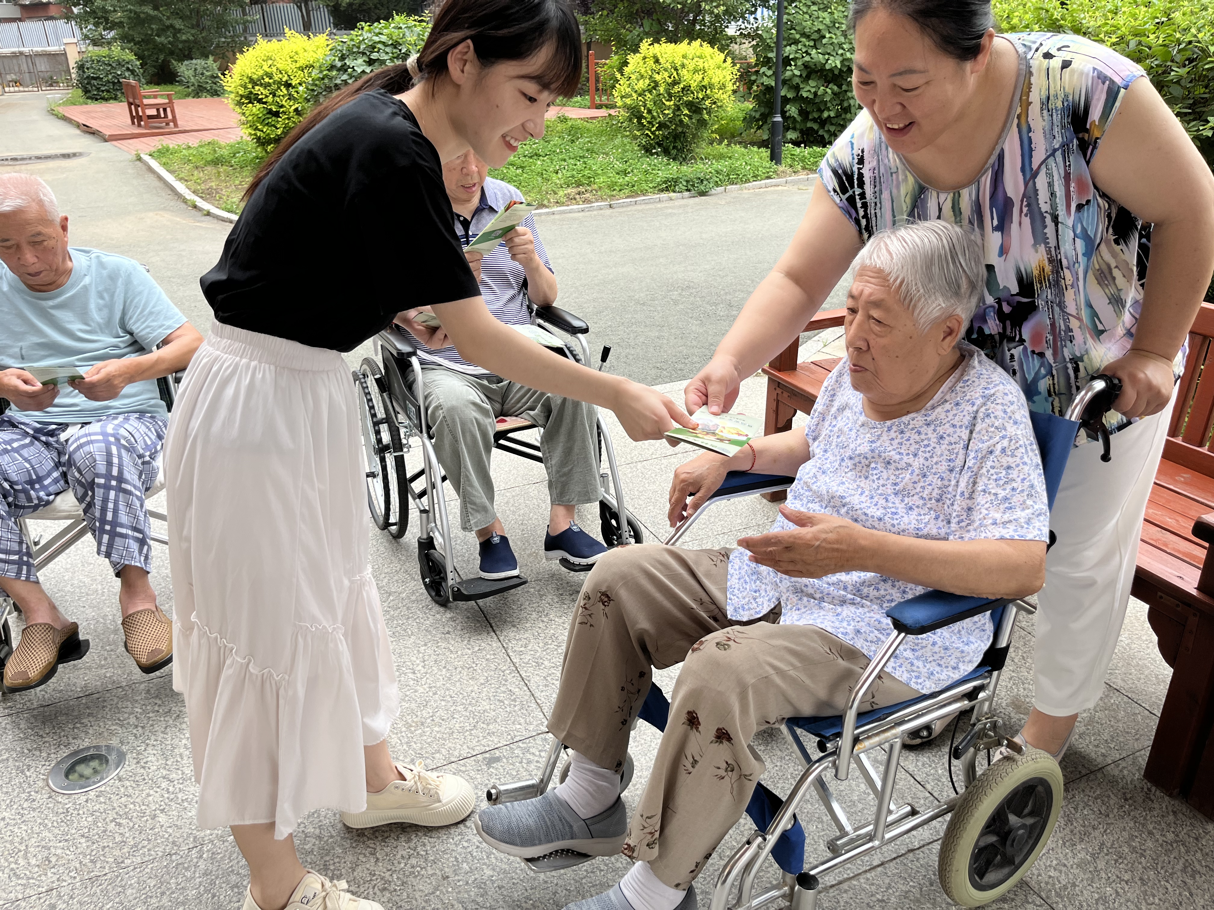活动中,刘姿爱同学就食品安全科普知识进行现场宣传,其余志愿者则向老人和护工们发放食品安全、健康小常识等相关主题的科普宣传手册,积极为大家答疑解惑,内容涵盖健康饮食、食品安全标准、野生菌安全知识等,筑牢食品安全第一道防线。期间,为丰富老人们的精神文化生活,志愿者们还为老人们带去了歌曲以及诗歌朗诵等节目。听到熟悉的歌曲,看到同学们热情的面庞和表演,养老院里的不少老人们随着歌曲的节奏打着节拍,场面一片其乐融融。表演结束后,志愿者与老人们话起了家常,讲讲养生小知识,分享研究生生活中的趣事,老人们也时不时地鼓励志愿者好好学习,做对社会主义现代化建设的有用之人。