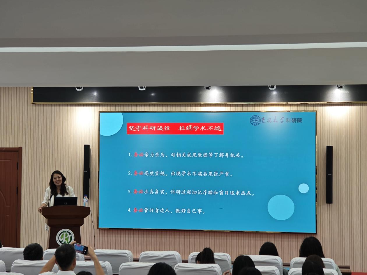 会上,邵老师详细解读了国家及学校层面关于科研行为规范的有关政策法规,倡议科技工作者应时刻保持对学术伦理的敬畏之心,将诚信原则内化于心、外化于行,将科研诚信贯穿于科研选题、实验设计、数据获取、成果发表及项目申报等全链条环节。