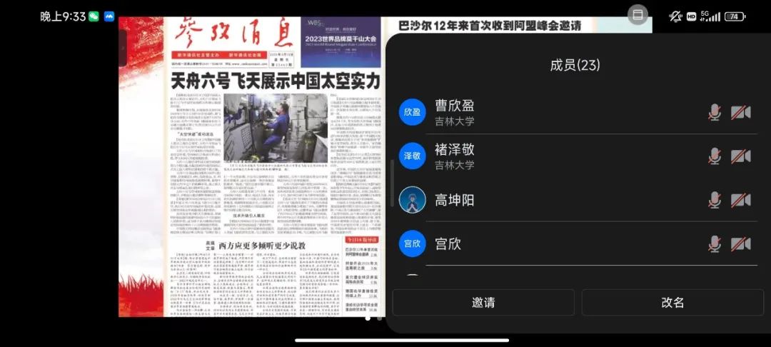 首先,主持人谢钰芊带领同学们一同观看了“参考消息”视频号上最新的几则新闻短讯,让同学们对目前世界形式有了简单的了解。接下来,同学们一起阅读了参考消息数字报,深入阅览了“天舟六号飞天展现中国太空实力”与“大陆推动对台工作高质量发展”两篇报道,通过学习阅读了解新时代的世界形式,了解我国的成就与大国风范。最后,潘科研、朱光宇等同学分享了自己的学习感受,团日活动圆满结束!