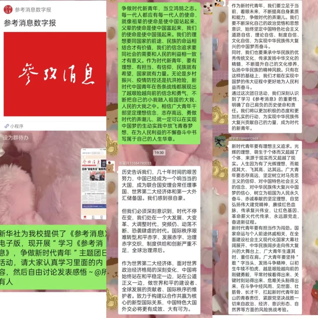 本次活动,团支书带领大家学习并讨论了有关《参考消息》的相关内容。同学们认真学习,热烈讨论,在此过程中受益匪浅。随后,以寝室为单位纷纷发表大家的意见想法,进行分享交流。同学们积极表达了作为新时代青年的责任与担当,更加明确了自己的志向,努力在最蓬勃的年华彰显最大的生命力。