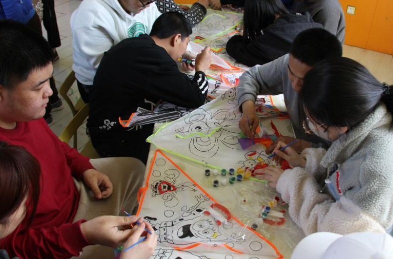 学生志愿者于2023年4月23日来到长春市宽城区“与光同行”特殊儿童训练中心,和“与光同行”的自闭症儿童一起制作风筝、放飞风筝。