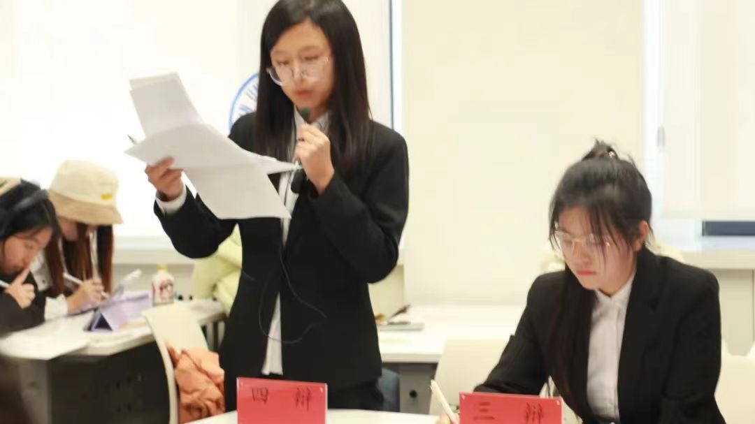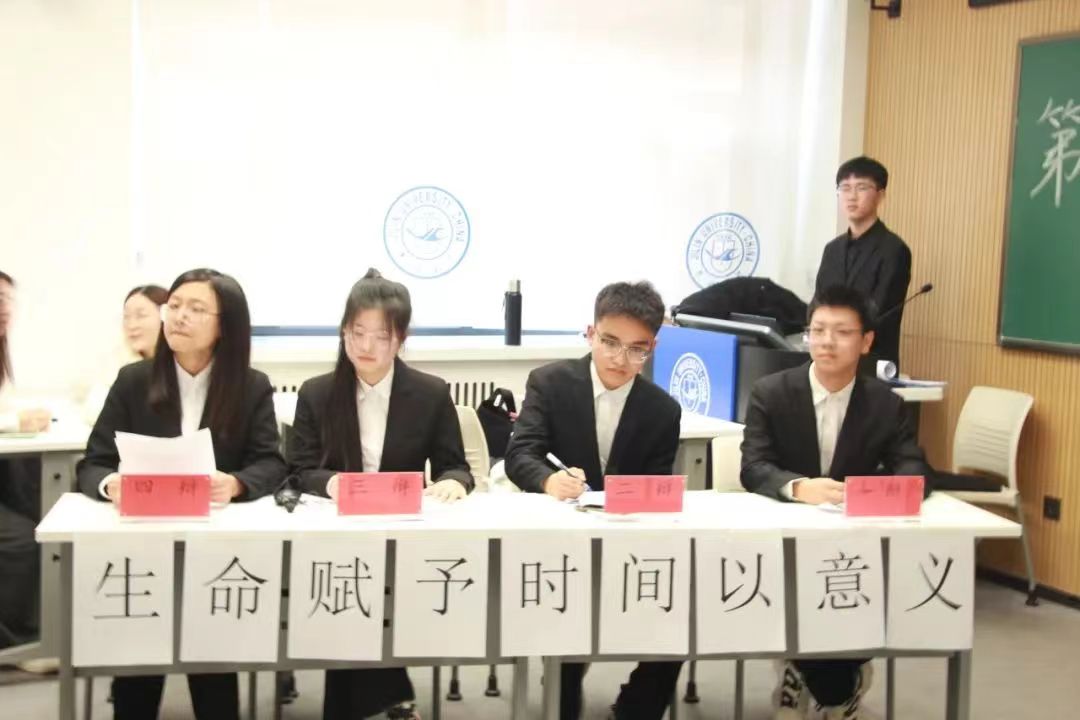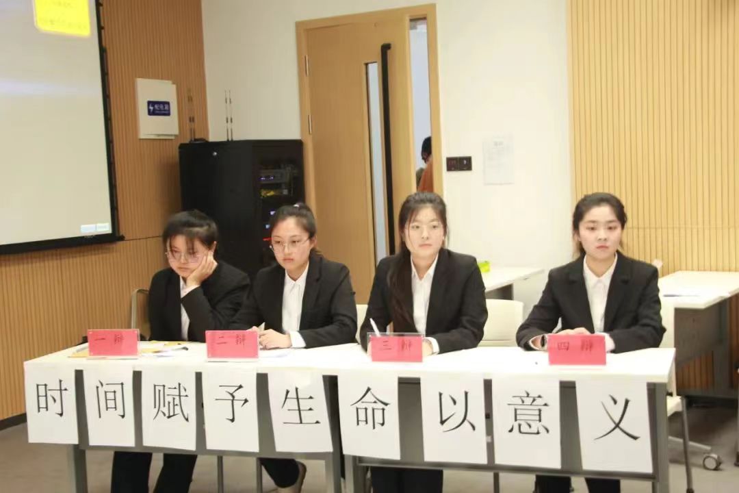 本次比赛正方秉持着“生命赋予时间以意义”的观点对阵反方“时间赋予生命以意义”的观点,比赛开始,双方一辩准确清晰,层层递进的表述了己方观点,观点清晰逻辑合理,为本场比赛后续选手的优秀发挥奠定了夯实基础,在随后的质询环节中,双方有来有回,反方凭借全队默契的配合和充分的准备赢得了一定的优势,值得一提的是,双胞胎姐妹花李雨欣和李雨露分别在两支队伍的三辩位置,两姐妹互不相让的发挥也为比赛增加了亮点,同时在自由辩论环节,双方唇舌交战,精彩非凡,正方一辩周诗博幽默又冷静的话风也为整个辩论赛增添了开心愉悦的氛围,在最后的结辩阶段,反方四辩游欣然总揽全局,以诚恳且富有感染力的总结陈词让正方所持的观点更加深入人心,带领反方走向了胜利,为此次交锋画上了句号。