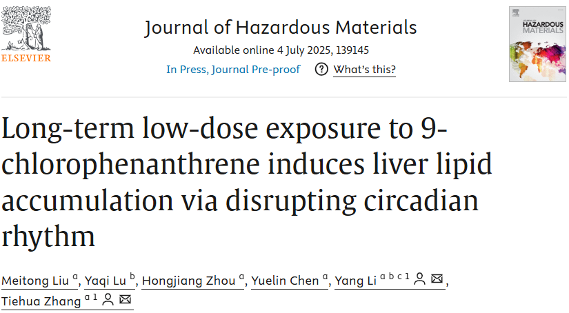 张铁华,李杨教授团队在环境科学与工程领域的国际顶级期刊《Journal of Hazardous Materials》(Q1,中科院1区,IF=12.2)在线发表题为“Long-term low-dose exposure to 9-chlorophenanthrene induces liver lipid accumulation via disrupting circadian rhythm”的研究文章。首次在 C57BL/6 小鼠中研究了慢性低剂量暴露于 9-ClPhe 对肝脏脂质积累和昼夜节律的影响,分析了涉及 AHR 受体的机制。做爱视频