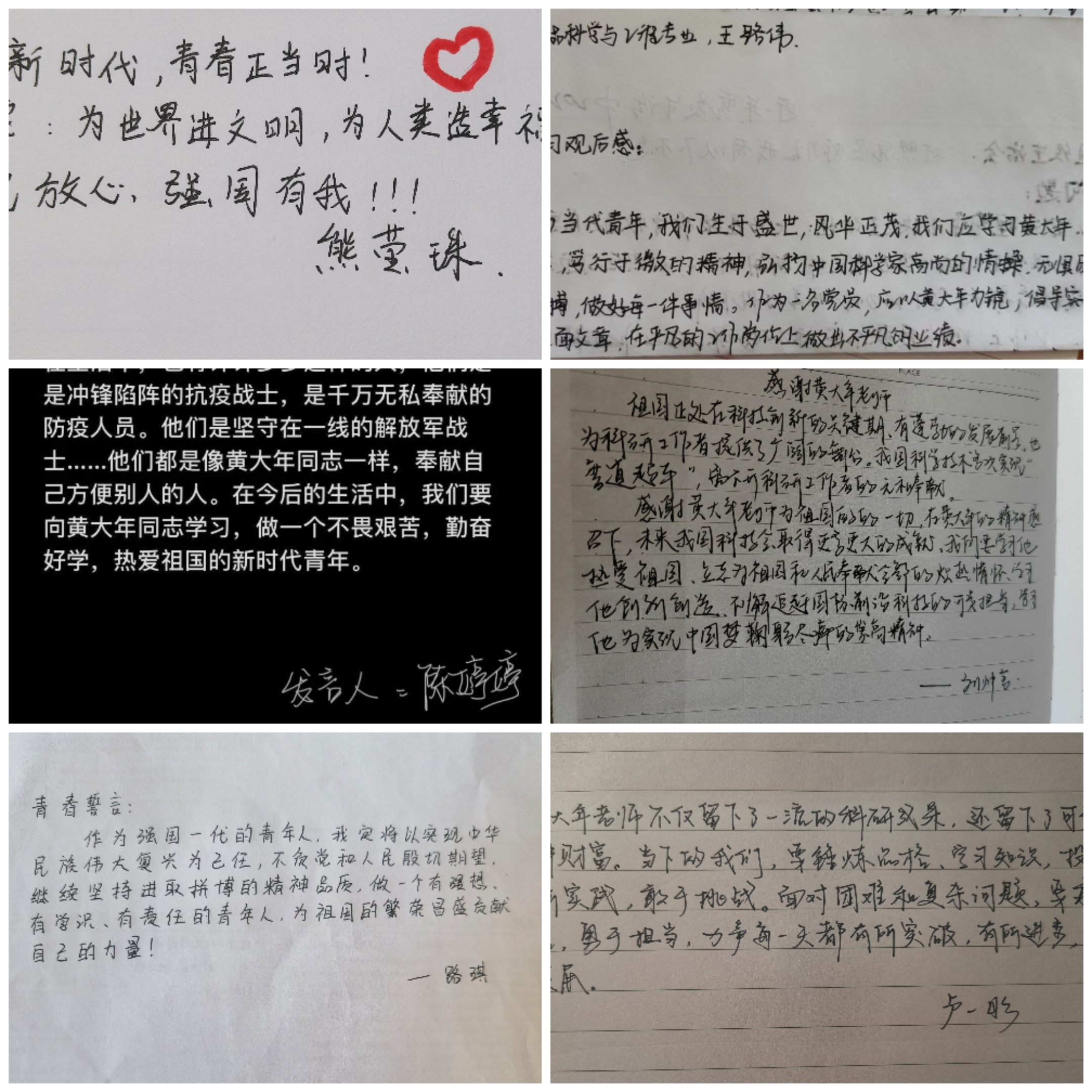 随后,在疫情期间,研究生党员们在志愿服务中实践责任使命、在网络空间传播正能量、在勤学明辨中提升担当能力,用青春之我在抗疫实践中谱写新时代青年的辉煌篇章。5名志愿者党员代表孟玲玲、马福英、张宇彤、肖晓玮和闫昭卉同志,就抗疫志愿活动的所见所闻所感所想进行了分享,他们讲述道:“作为党员,要时刻牢记初心使命,在群众需要我们的时刻挺身而出,在思想和行动等各方面都要发挥表率作用。”“如果疫情是一个漫漫长夜,这长夜却如成人礼,让年轻的生命绽放绚丽的光彩!青春无敌、青春无悔、青春无畏、青春万岁”。其他学生党员也被黄大年精神和抗疫精神所感染,纷纷写下青春誓言,党员路琪说到:“我定将以实现中华民族复兴为己任,做一个有理想、有学识、有责任的青年人。”