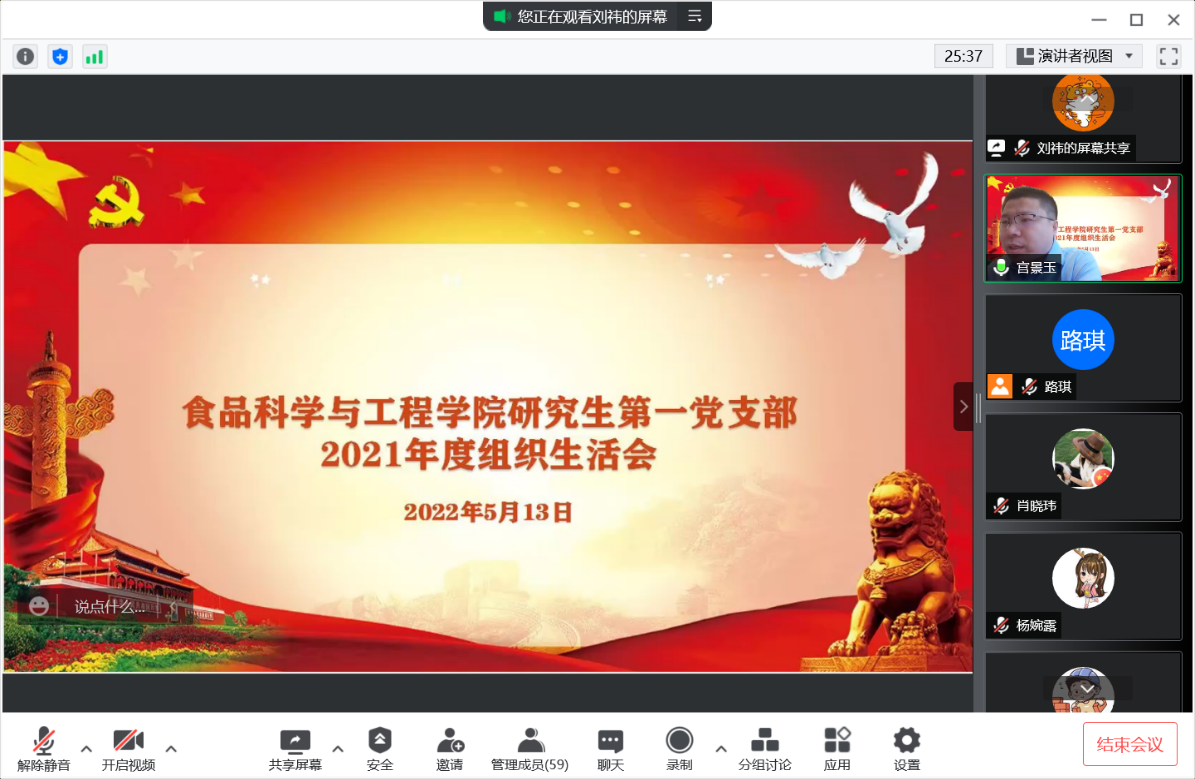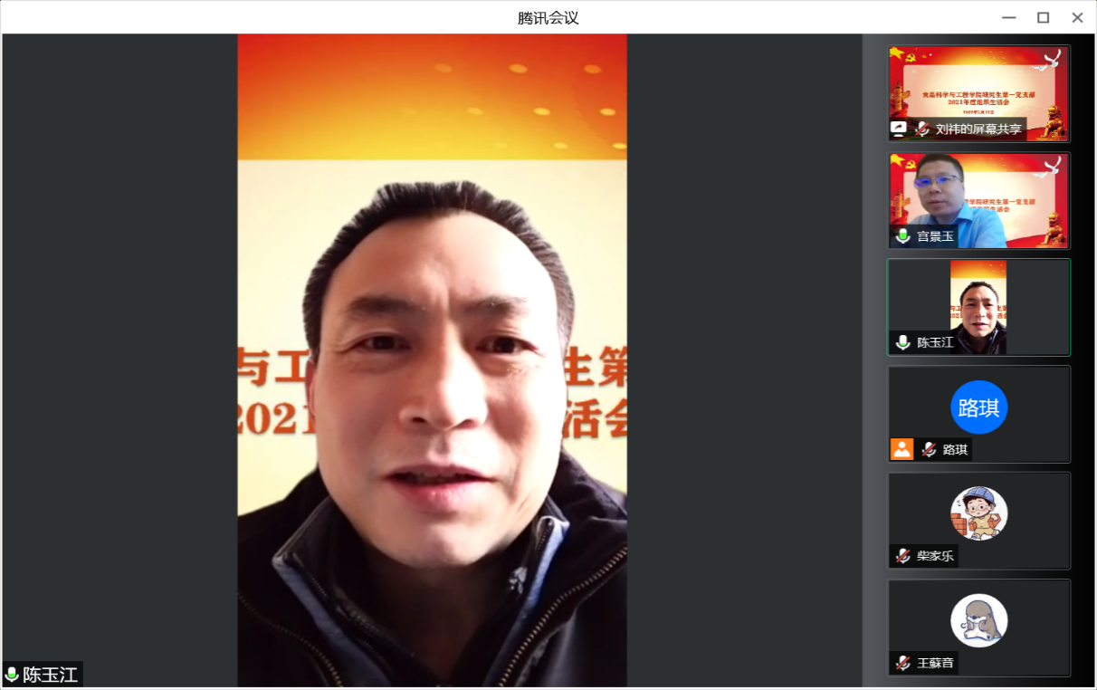 研究生第一党支部以腾讯会议形式召开2021年度组织生活会。支部联系院领导陈玉江副院长参会指导,党支部的全体党员参加了此次会议。会议由党支部书记宫景玉主持。