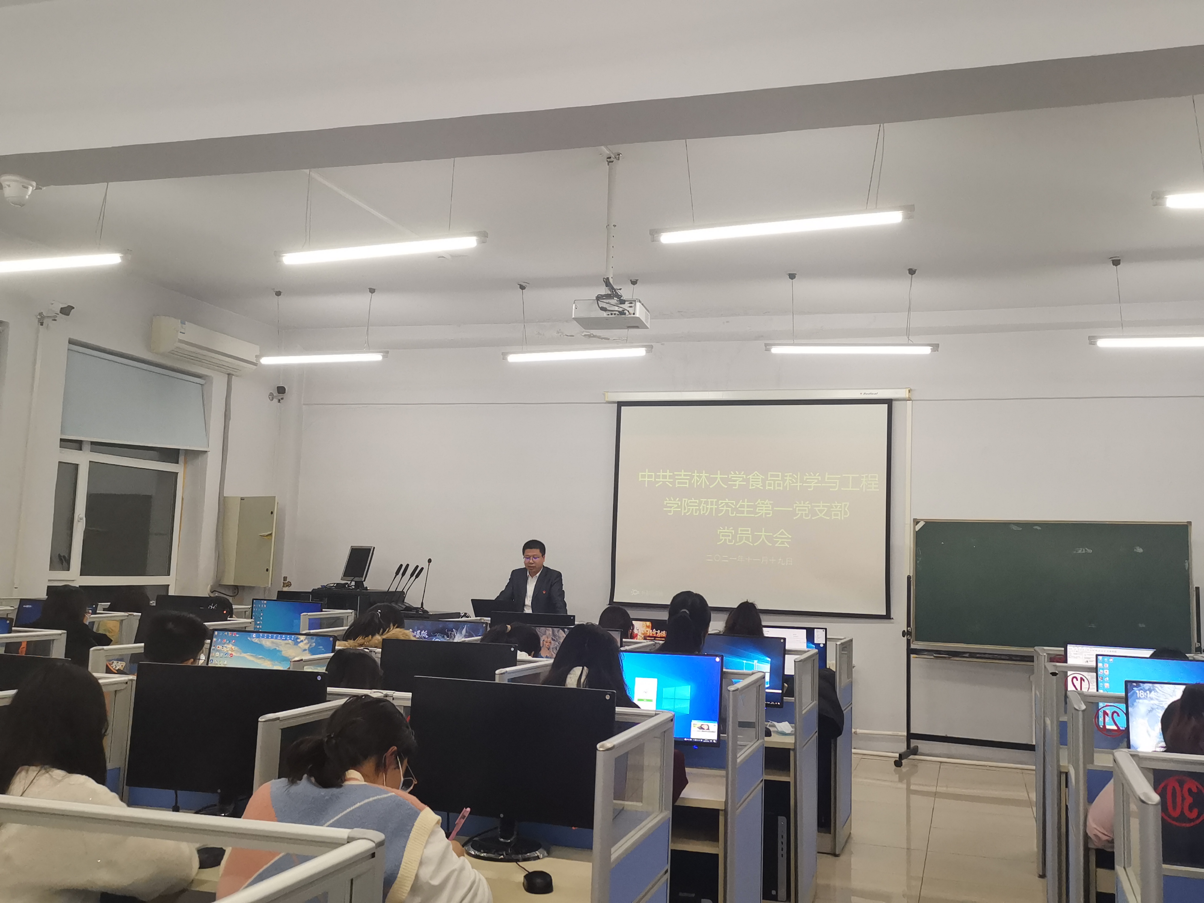 研究生第一党支部在食品楼机房召开党员大会,会议由支部书记宫景玉主持。此次大会有两项议程,第一项议程,积极落实“第一议题”制度,学习十九届六中全会精神;第二项议程,讨论和表决接受陈美如等六名发展对象为预备党员。