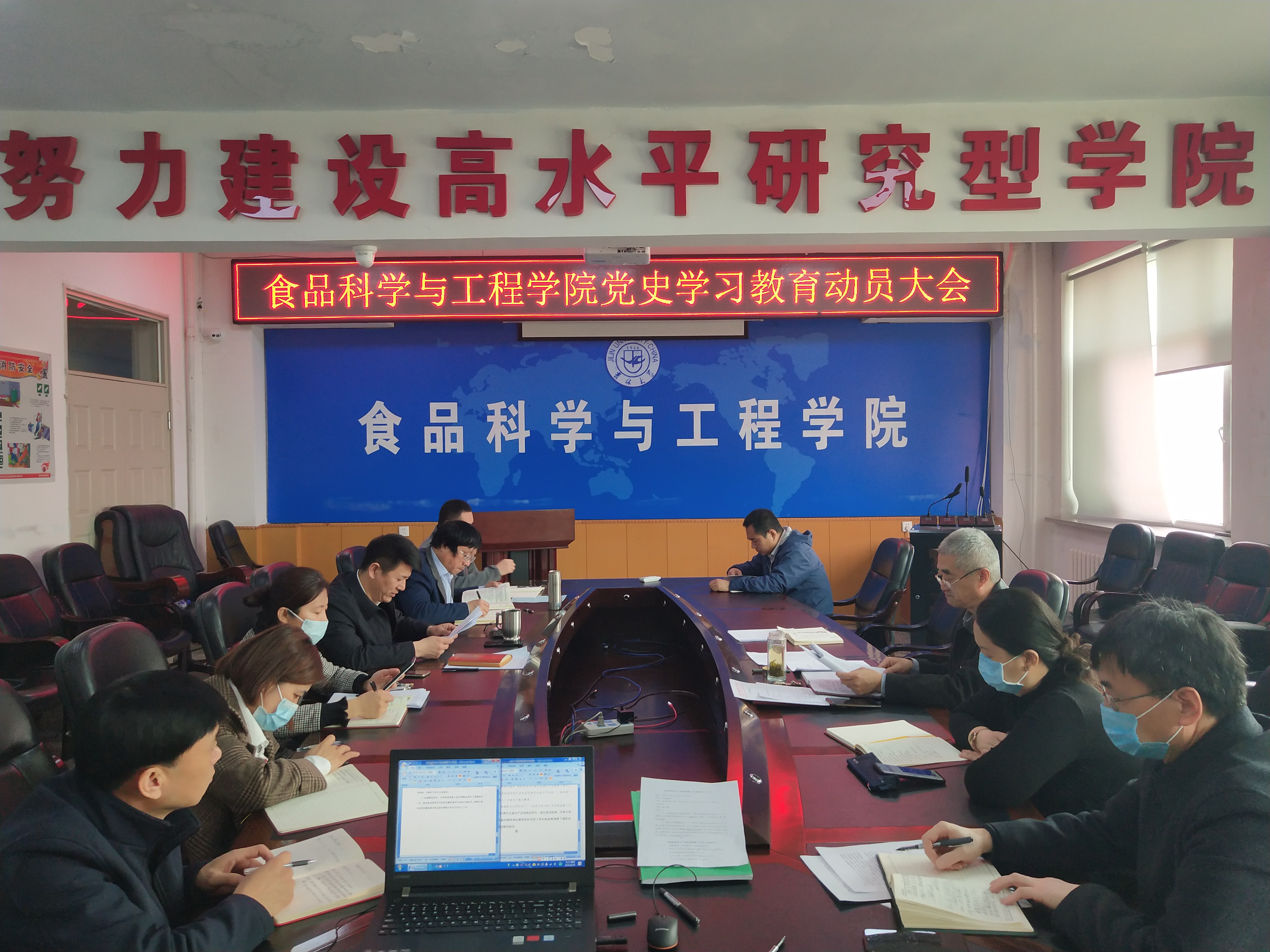 在食品楼三楼会议室召开党史学习教育动员大会,对学院党史学习教育进行全面动员部署。学院领导班子成员、党委委员、纪委委员,各党支部书记参加了会议。学院其他教职工党员通过企业微信在线上参加了会议。会议由学院党委书记董怀智主持。